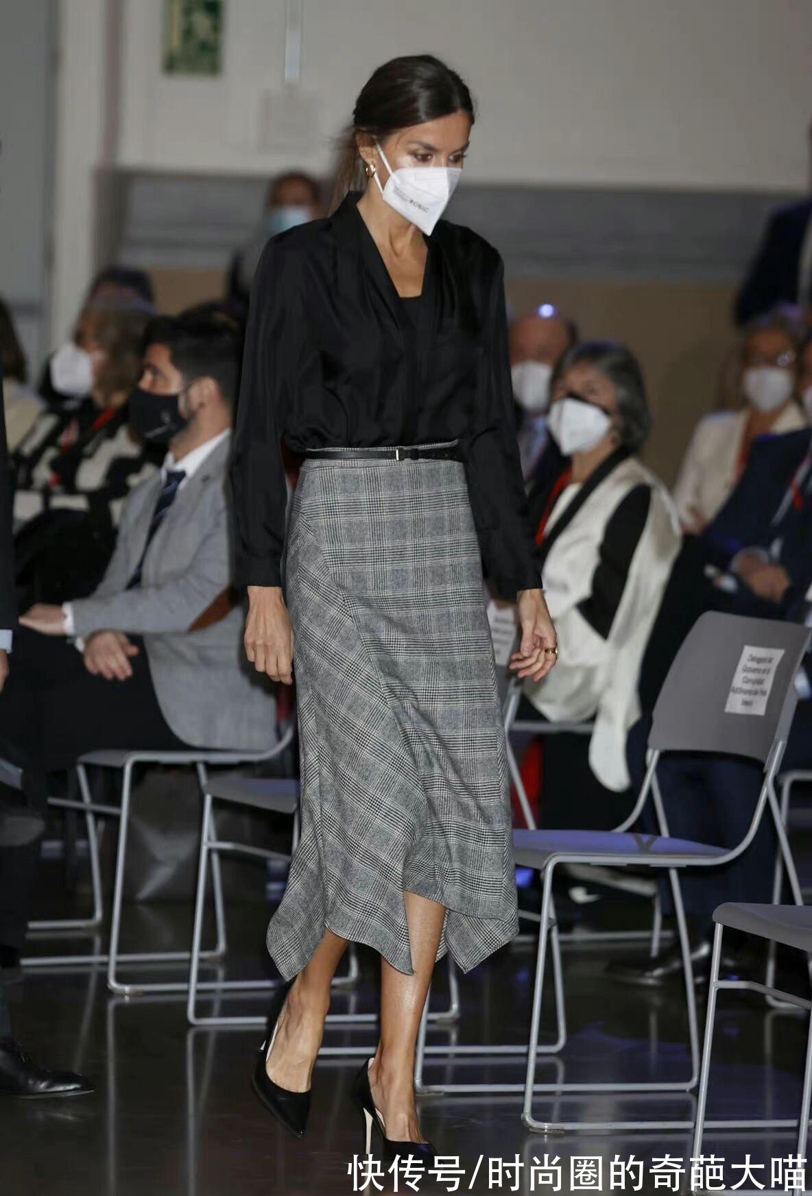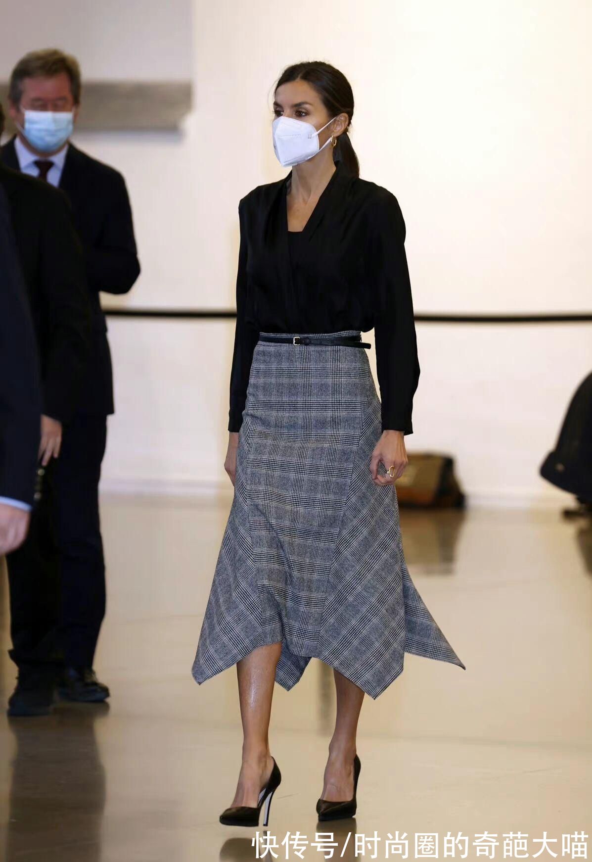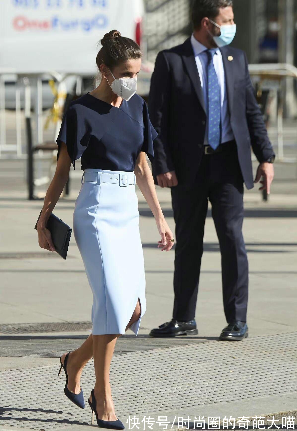 一深一浅的搭配是职场女性最常见的配色,尤其是同一颜色深浅不一的单品怎么穿怎么美。西班牙王后天蓝色半裙搭配深蓝色上衣,可盐可甜还大气高级。配饰上也呼应上衣的颜色和谐统一也不失格调,由此可见她深厚的穿搭功力。